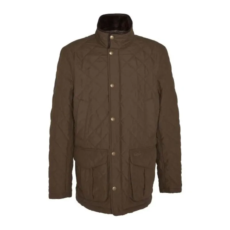 Quilted 2” box pattern jacket with a polyester microfibre outer. This jacket features lower and handwarmer pockets. It also has 8 wale cord in the inner collar and is finished with leather binding.