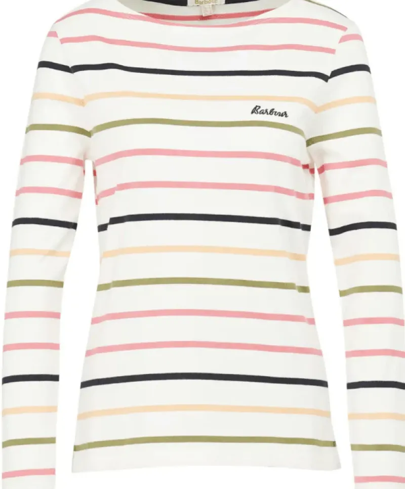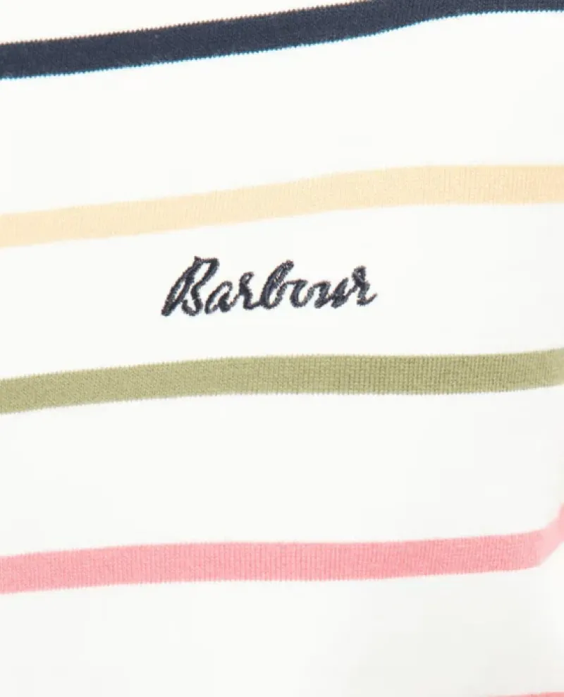 A must have from the Barbour collection, the Women’s Barbour Hawkins Top features a new stripe design with a contrast Barbour script embroidery to the left chest. This long sleeve tee is crafted from 100% cotton for a comfortable and breathable wear you will reach for again and again. Finished with slim metal Barbour ID bar to the back neck.