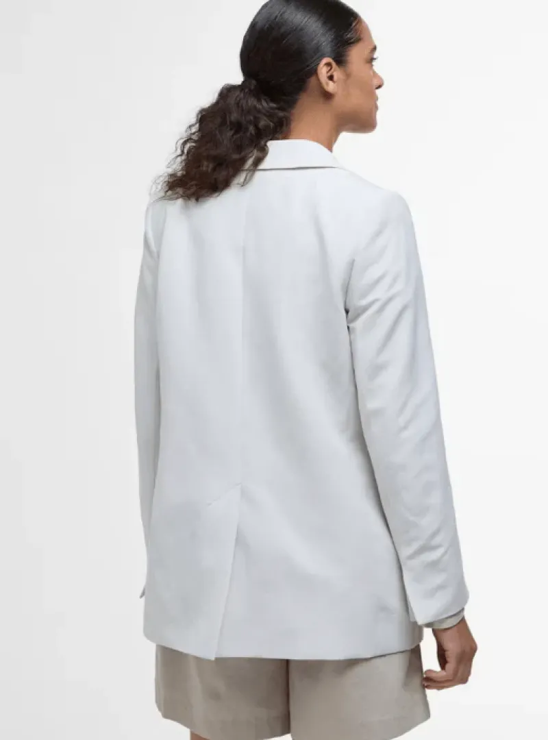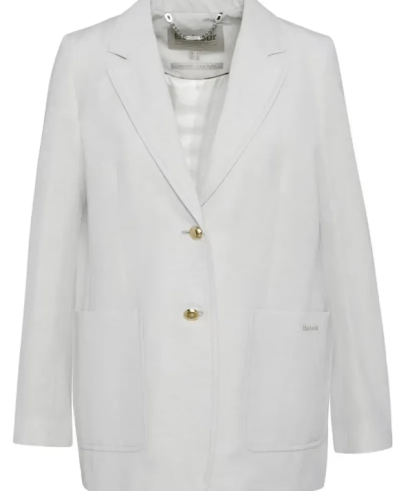 This drapey linen blend women’s Barbour Monarch Tailored Jacket is perfect for a soft, tailored look with a relaxed feel. Designed with a flattering cut-away front and a single dome button closure, it offers effortless style for any occasion. The unlined finish keeps it lightweight, while the tartan binding inside adds a touch of Barbour heritage. Whether layered over casual or dressier outfits, this tailored jacket combines comfort and style, making it an easy choice for refined, everyday wear.