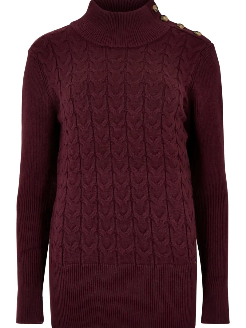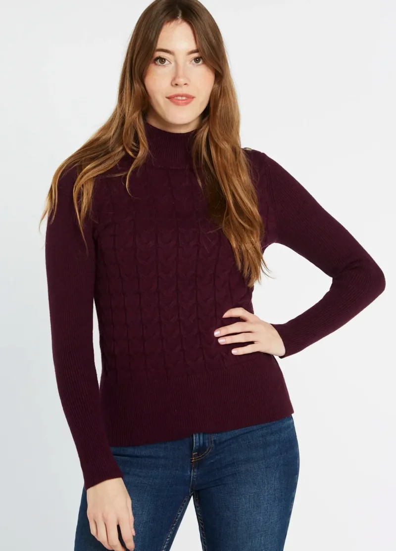 The Claremont sweater from Dubarry is possibly the softest cable knit sweater you will ever own. This stunning sweater in Ox Blood Red is beautifully stylish and looks great with jeans, chinos or a skirt.
