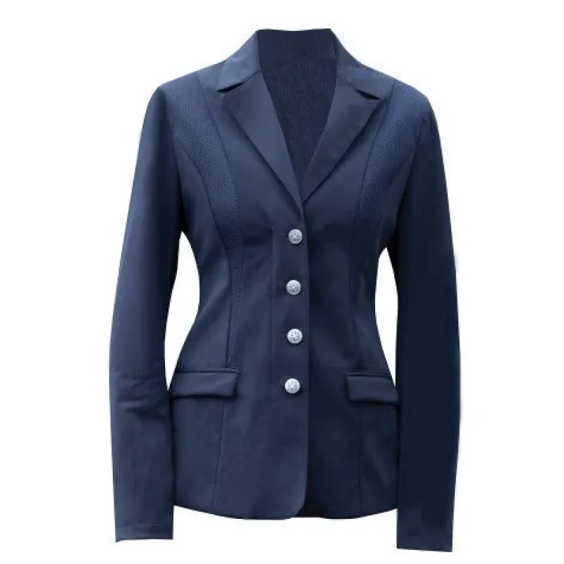 This sports luxe competition jacket is for riders who like to keep their cool in competitions. This new innovation breathable competition jacket features contour mesh panels allowing airflow to allow you to perform your very best in the saddle. Other features include a double-vented back and hidden front zip fastening with Equetech engraved button fastening. This low-maintenance jacket is tailored to feel like your favourite blazer and is styled in a durable woven fabric with 6% spandex for superb stretch and shape retention. Designed to complement your curves, this gorgeous garment allows you to concentrate on the more important things in life, such as celebrating a great test, round or moment with some post-competition cuddles with your equine friend, even if he decides to slobber all over you! Other features include Equetech exclusive crystal button to the front with button-up detail, supported by a cleverly hidden zip placement for a secure and smart finish to prevent gaping, double back vents, contoured sleeves and mesh lining. Nylon/ Spandex. Machine washable.