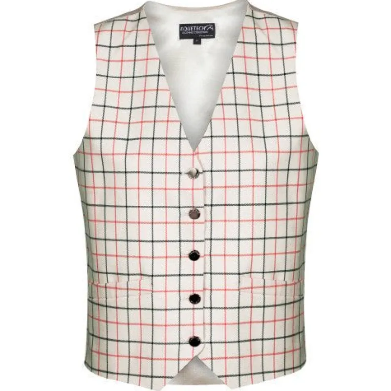 A classically styled twill waistcoat in traditionalĀ tattersall check cloth. Ideal for hunting, in-hand and ridden showing. Features engraved Equetech Gold buttons, satin back with adjustable concealed elasticated panel to back and traditional fixed flap / pocket welts. 55% Polyester/ 45% Viscose. Machine washable.