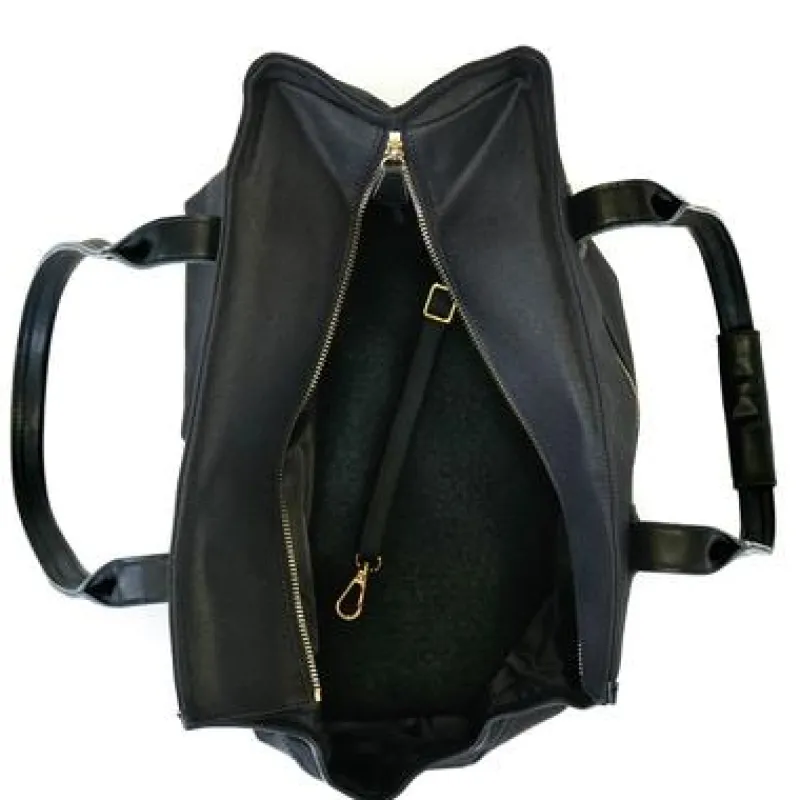 - Leather handles can be secured together with snapping flap