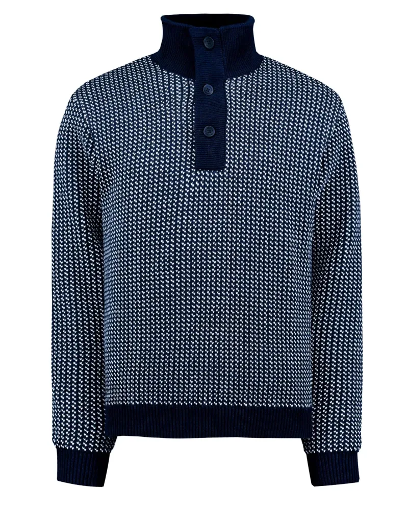 A pattern knitted sweater with windproof lining. Available in two classic patterns. High collar with both zipper and decor buttons. Ribbed details.
