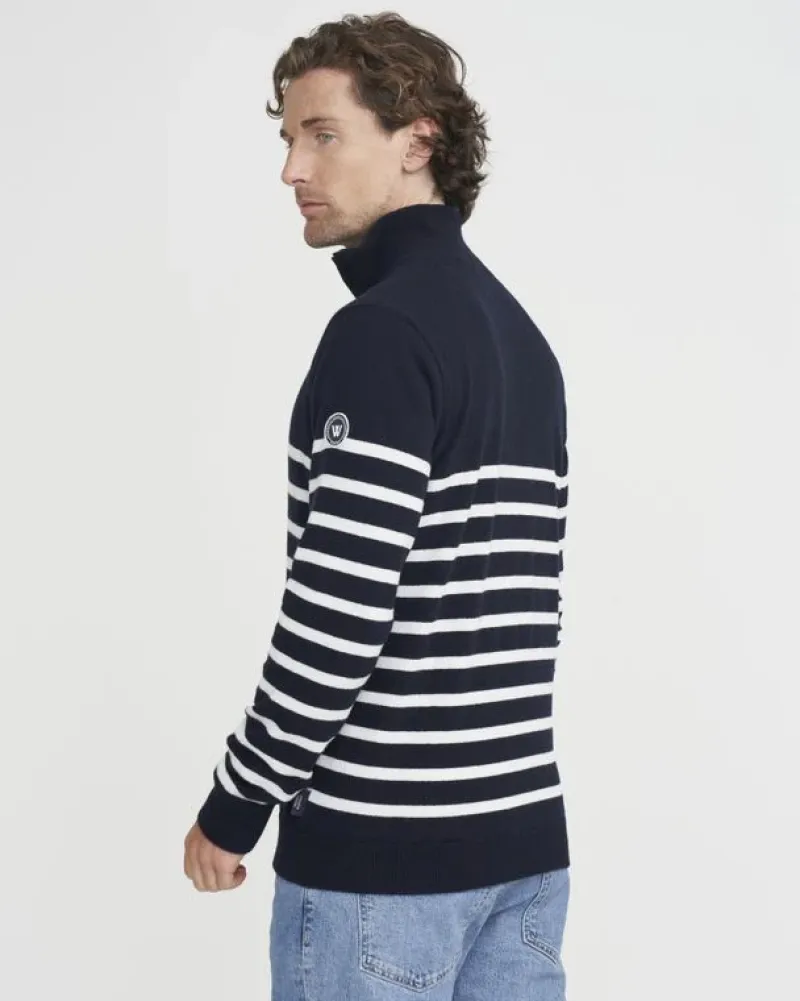 Knitted windproof sweater in 100% soft merino wool. Rib knit collar with zip and rib knitted endings.