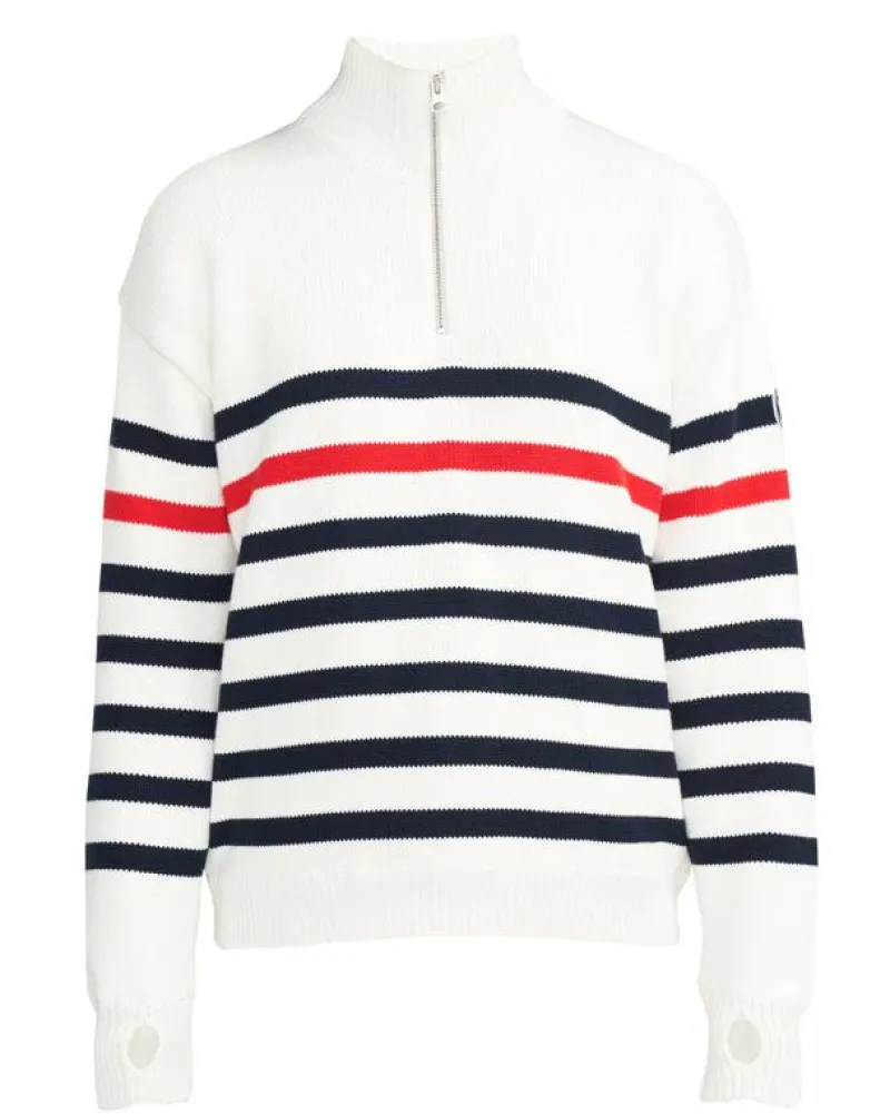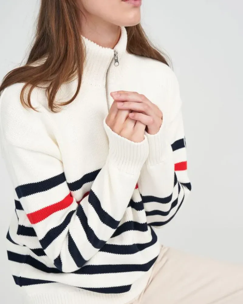 A knitted windproof sweater in cotton with classic stripes. Relaxed fit with dropped shoulder and metal zip at front.