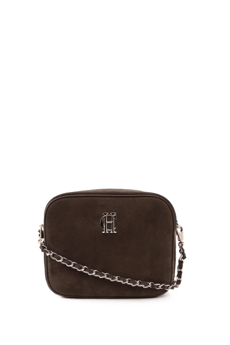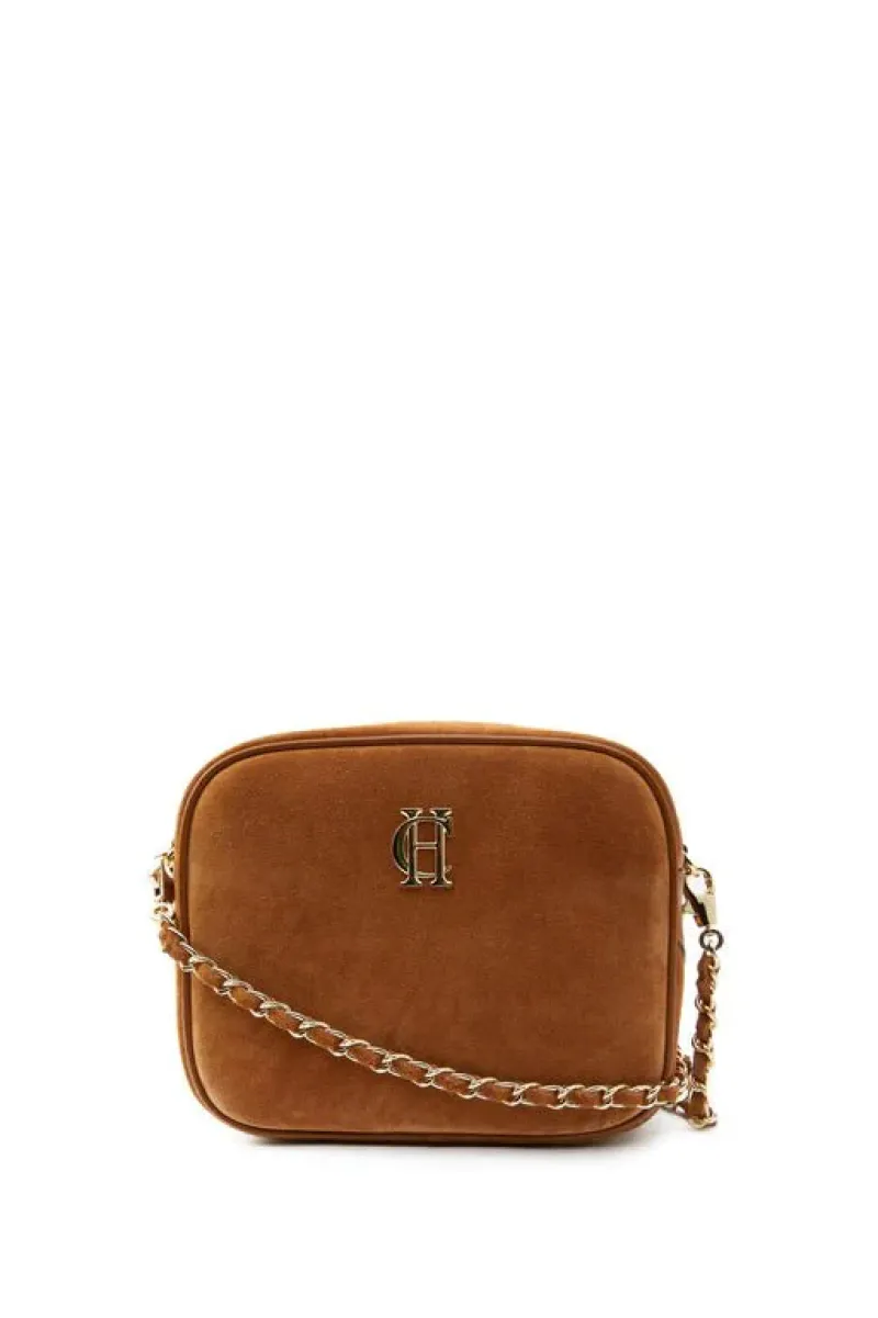 Designed with a classic camera bag shape from premium leather, this bag has been created with a sleek compact profile for ensuring your valuables are kept safe. With an elegant chain shoulder strap with HC trim & bold HC logo to the front.
