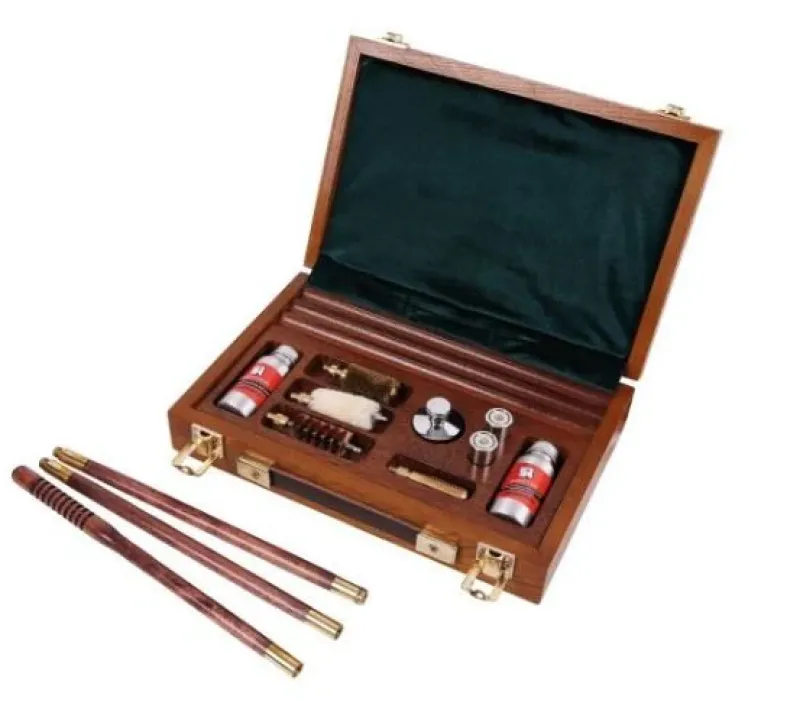Deluxe wooden boxed kit. Includes three piece deluxe rod, Youngs ‘303’ oil, Express Gun Oil, phosphor bronze brush, wool mop, brass jag & Payne Galway Brush (or Wire Loop in 16G and 28G), nickel snap caps & nickel oil bottle.