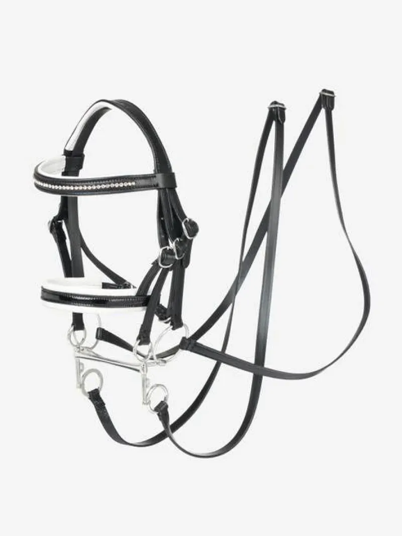 A snazzy crystal padded browband gives the LeMieux look, while a soft white leather and black patent leather padded noseband lends an authentic dressage appearance.