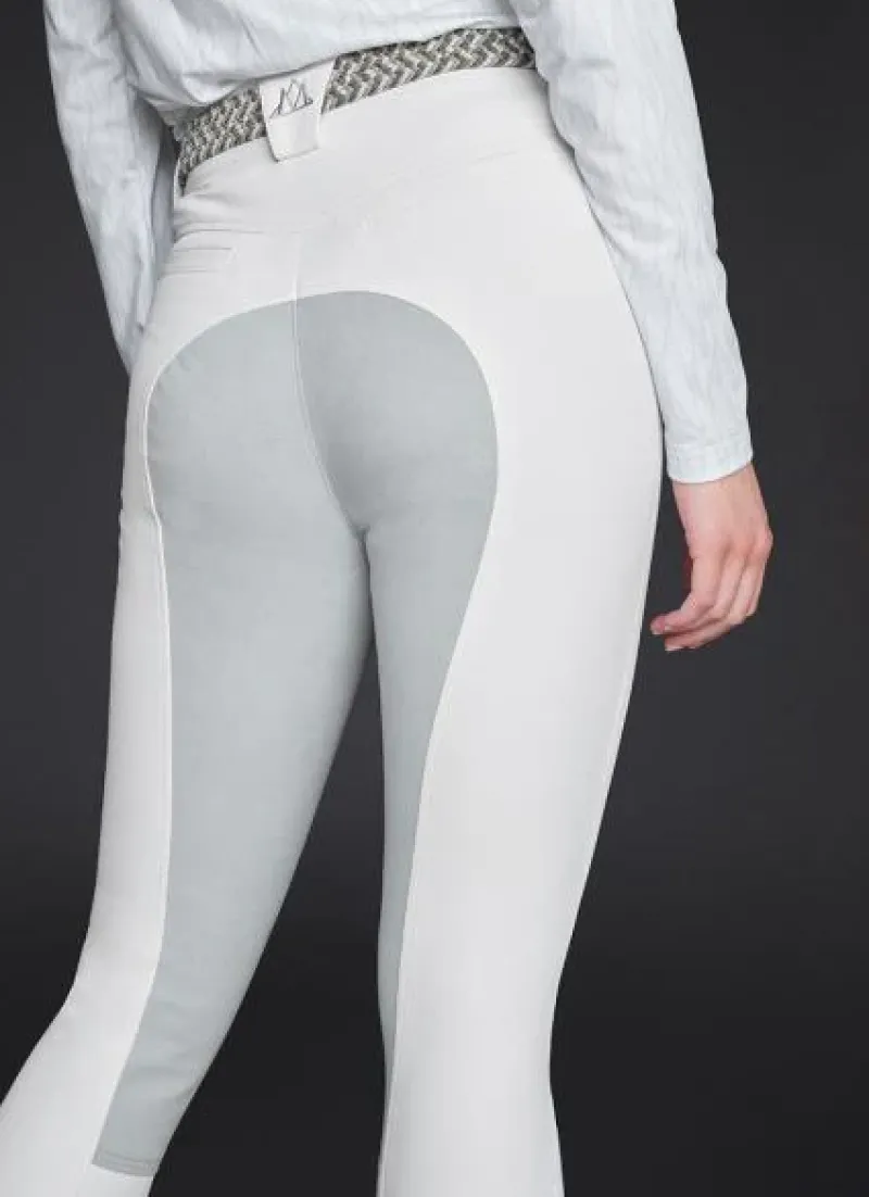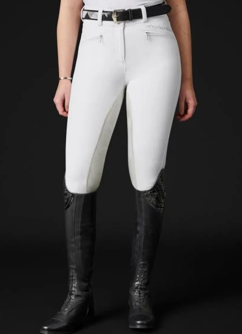 The Mountain Horse Diana Breeches have been improved with the addition of a full seat made of clarino. Featuring a high waist and fullseat Clarino grip, these breeches also boast front pockets with zipper closures and a flexible cuff at the bottom.