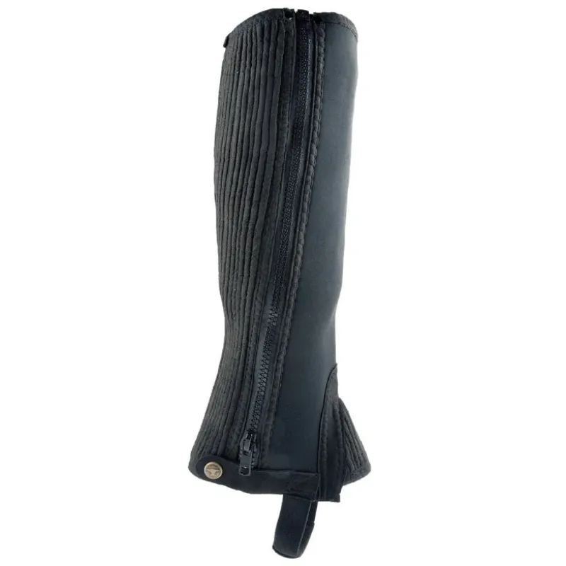 Our Cleveland neoprene half chaps are ideal for cold and damp conditions, Outer: Neoprene, Fastener: YKK⢠zip, Additional features: Reinforced elastic stirrup, security strap and brass popper, Colours: Black and Brown, Sizes: X-Small – X Large, The Neoprene has a natural water-repellent property which can be wiped or washed to remove dirt or grime., Warm and lightweight, these chaps are ideal for the colder seasons., Made from superior Neoprene with a YKK⢠zip and elasticated side panel which gives the effect of a beautifully contoured chap. , This chap also includes a reinforced elastic stirrup and a Tuffa zip closure to keep the zip in place whilst in use.