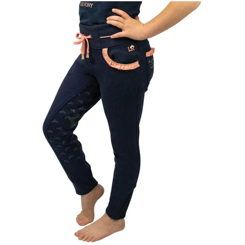 Designed in dark navy stretch material and elasticated waistband with drawstrings, your child is guaranteed to remain comfortable both in and out the saddle. The silicone crown patterned full seat and silicone ponies at the knee ensure added grip and security when in the saddle. Finished with peach frill trim, practical front and rear pockets and rose gold ‘Princess and the Pony’ slogan and sparkly rose gold pony to the pockets. Match with the ‘Princess and the Pony’ collection.