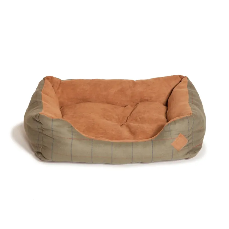 A subtle blend of country green tweed and tan faux suede. A rectangular-shaped bed featuring deep filled fibre shoulders for enhanced comfort with a drop down front for easy access. The complete bed is fully washable and the base cushion is removable for that quick wash. It also features a non slip base. The deep supersoft polyester fibre offers a superbly comfortable bed for the discerning pet. Attractively badged with the Danish Design paw print motif and featuring contemporary styling.