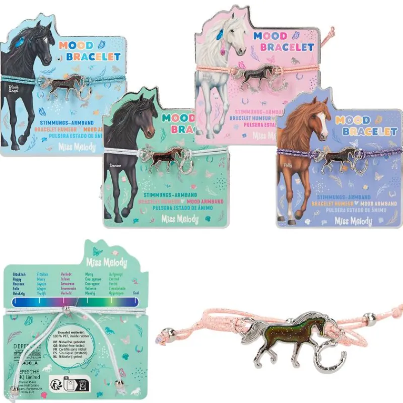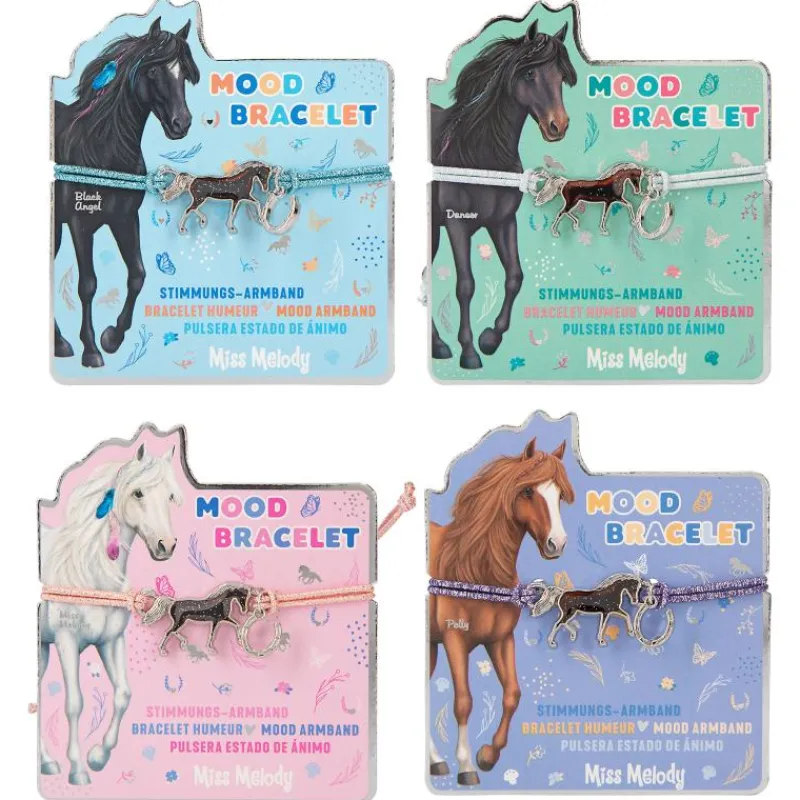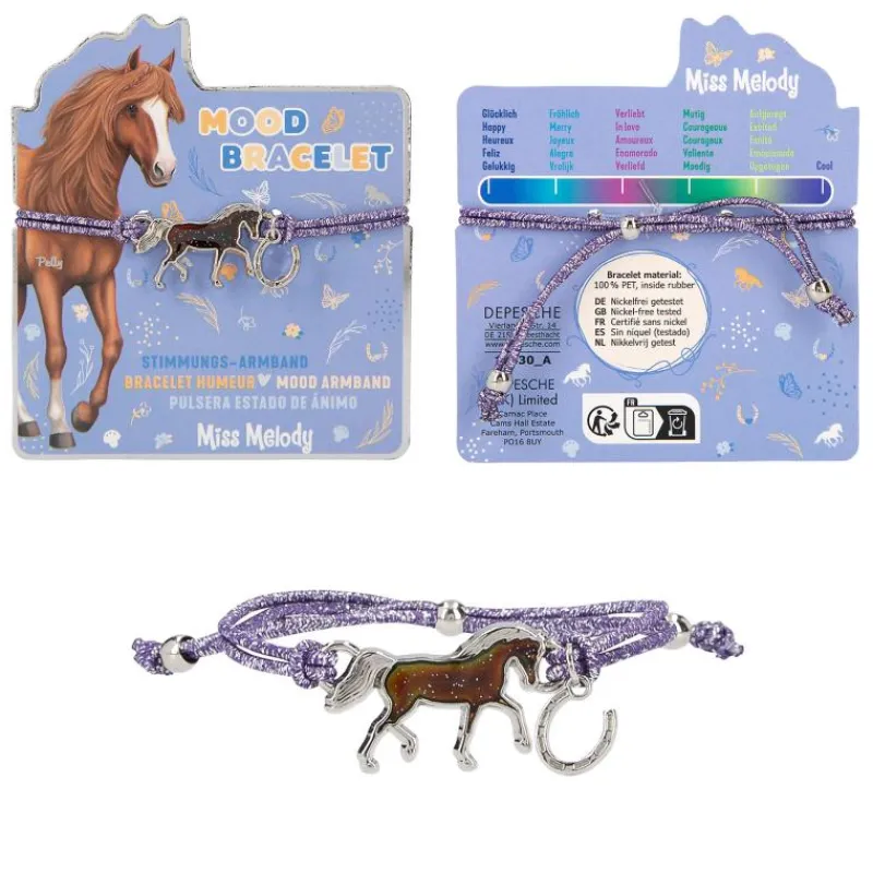 How is your mood? The Miss Melody bracelet reveals it with its horse- shaped mood barometer (temperature-dependent colour change). Another small horseshoe pendant hangs from the elastic, colourful glittering, easily adjustable bracelet. 4 different bracelet designs available. Nickel-free tested.