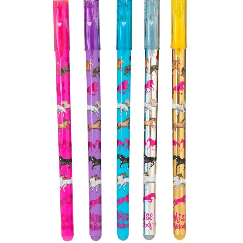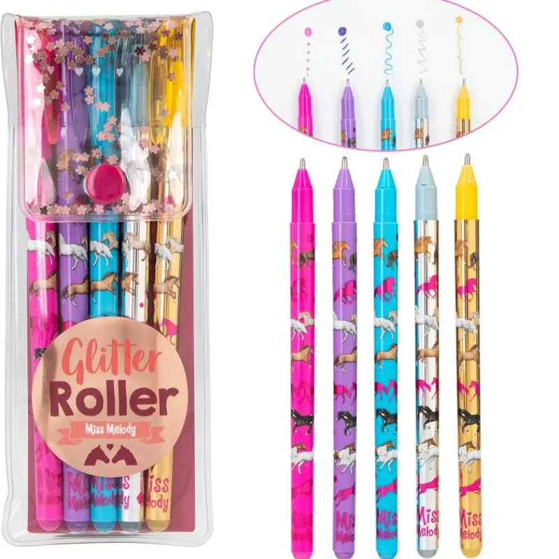 Stroke by stroke glitter-genius: The 5 glitter gel pens from Miss Melody in pink, purple, blue, silver and gold have a pretty allover horse print on the outside and are packed in a transparent push-button pouch with movable flower confetti. (Pencil leads are not interchangeable).