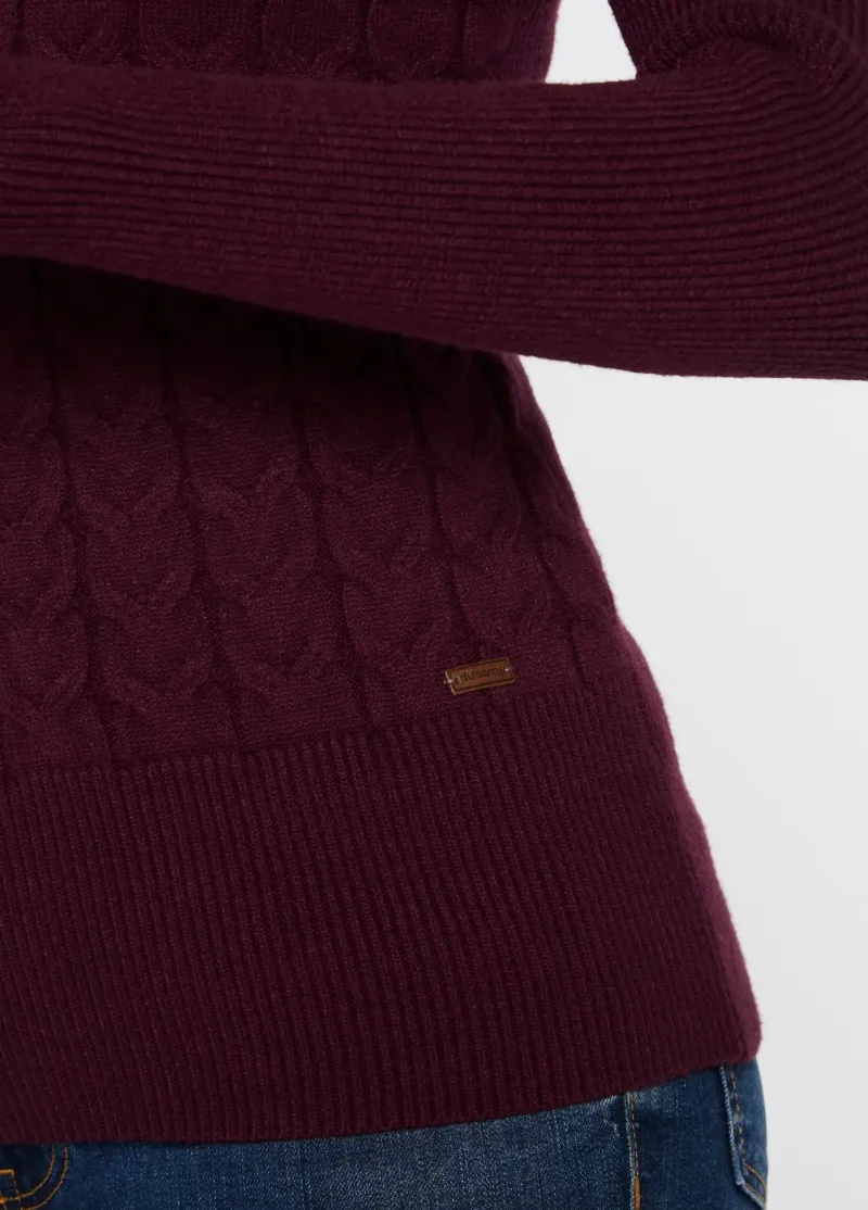 The Claremont sweater from Dubarry is possibly the softest cable knit sweater you will ever own. This stunning sweater in Ox Blood Red is beautifully stylish and looks great with jeans, chinos or a skirt.