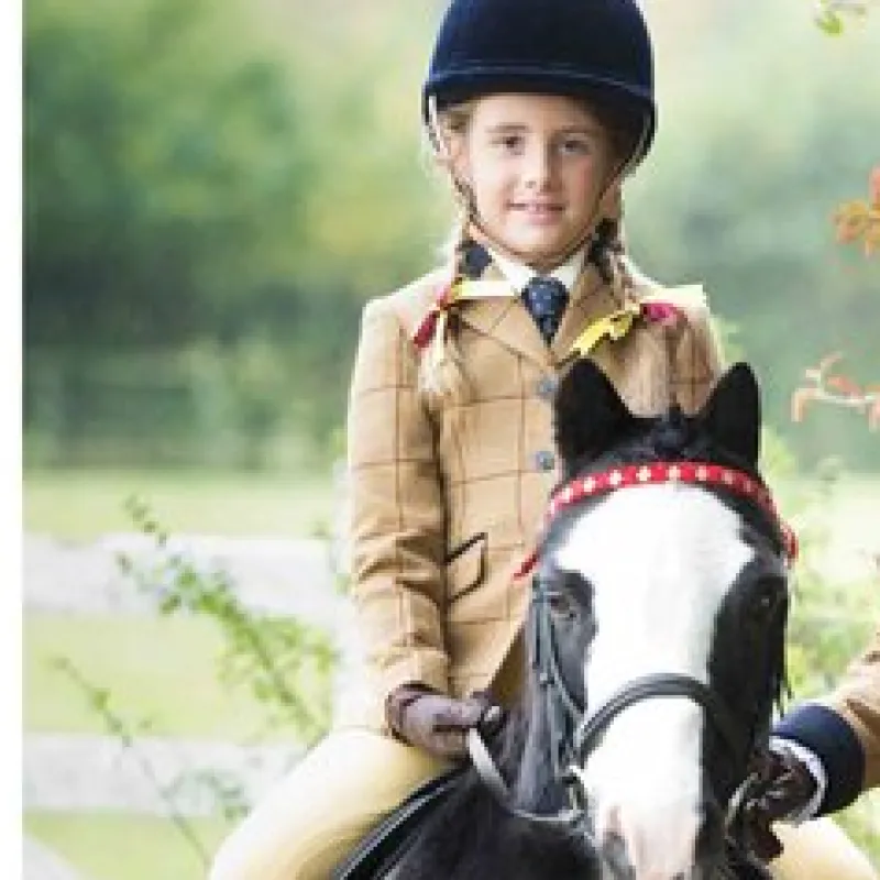 Exclusive Equetech® tweed show jacket in brown herringbone tweed with striking Burgundy and Canary over checks.
