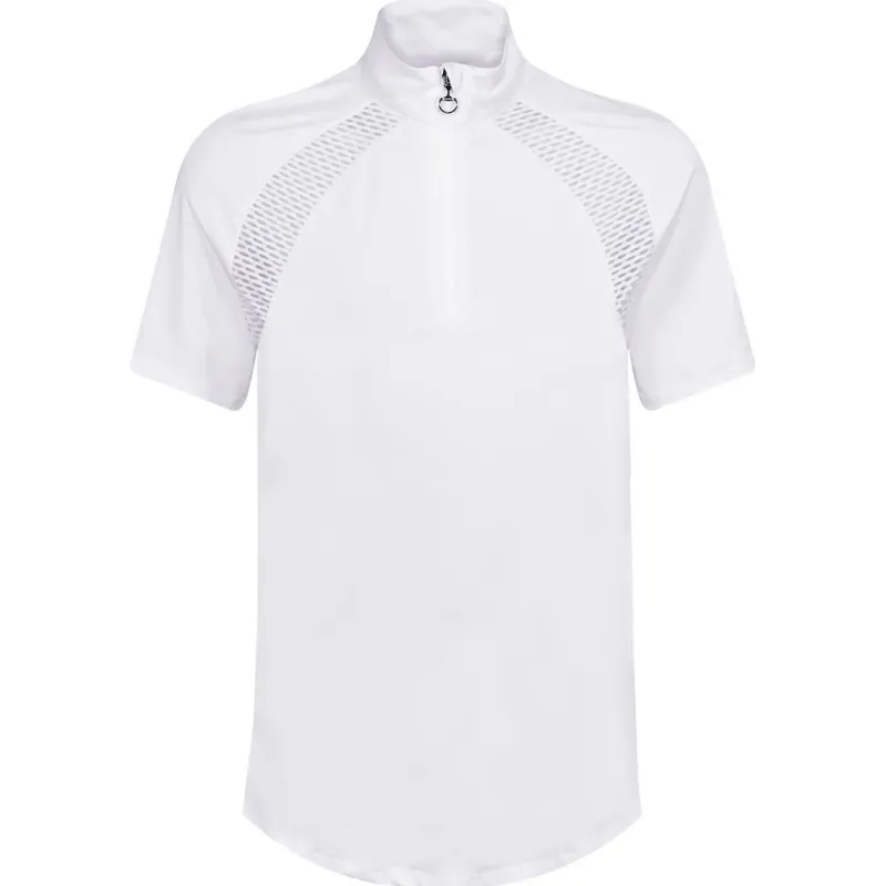 This competition shirt boasts raglan sleeves with mesh inserts that encircle the body, providing young riders with unparalleled comfort and ventilation while riding, allowing for peak performance. The garment also includes a zip front with Equetech’s recognizable horse bit puller, a loop at the back of the collar, the Equetech logo on the sleeve, and a scooped back hem.