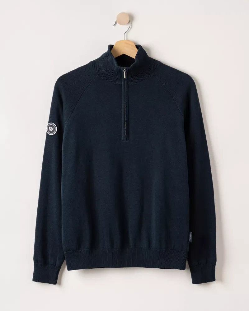 Knitted sweater with windproof lining in 100% cotton. A finely knitted basic sweater with a high collar and zipper. Regular fit with ribbed cuffs.