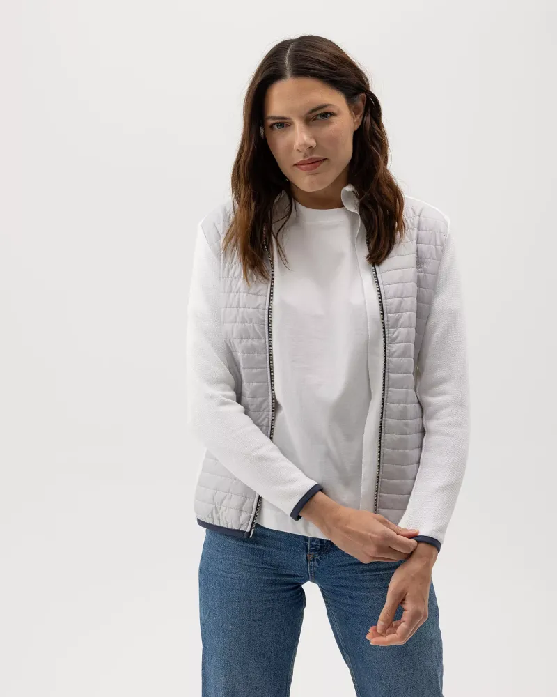 Knitted windproof jacket in cotton. Quilted water-repellent details with a membrane made of Swedish wool. Two-way zipper and elastic bands at the end. Practical pockets. Regular fit. The jacket has a windproof lining consisting of 96% polyester and 4% elastane. No chemicals are used to achieve the windproof function. Instead, the lining is manufactured with a special weaving technique that makes the fabric extremely tightly woven and therefore also windproof, while the fabric is breathable. The elastane makes the fabric stretchy, which means that it stops the wind but not movement. The fabric is marked with ÖKO-tex® Standard 100, which guarantees that the fabric is free from substances harmful to health.