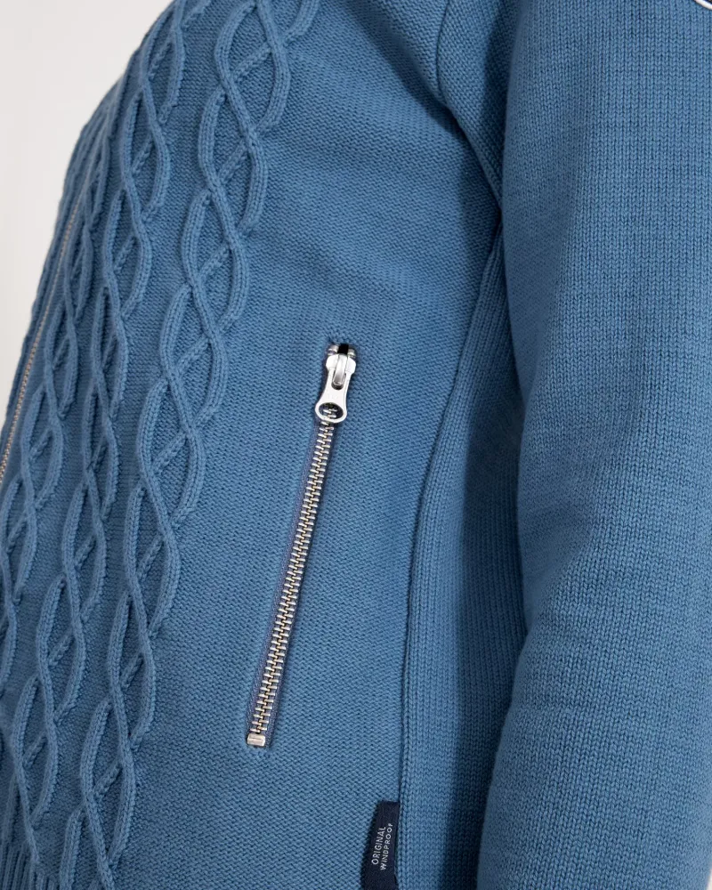 Knitted sweater with zipper and windproof lining, made of 100% organic cotton. Classic cable knit at the front and plain knit at the back. Sturdy two-way zipper and side pockets with zipper. The sweater has a windproof lining that consists of 96% polyester and 4% elastane. No chemicals are used to achieve the windproof function. Instead, the lining is manufactured with a special weaving technique that makes the fabric extremely tightly woven and therefore also windproof, while the fabric breathes. The elastane makes the fabric stretchy, which means that it stops the wind but not movement. The fabric is labelled with ÖKO-tex® Standard 100, which guarantees that the fabric is free from harmful substances. Sustainably produced in Europe.