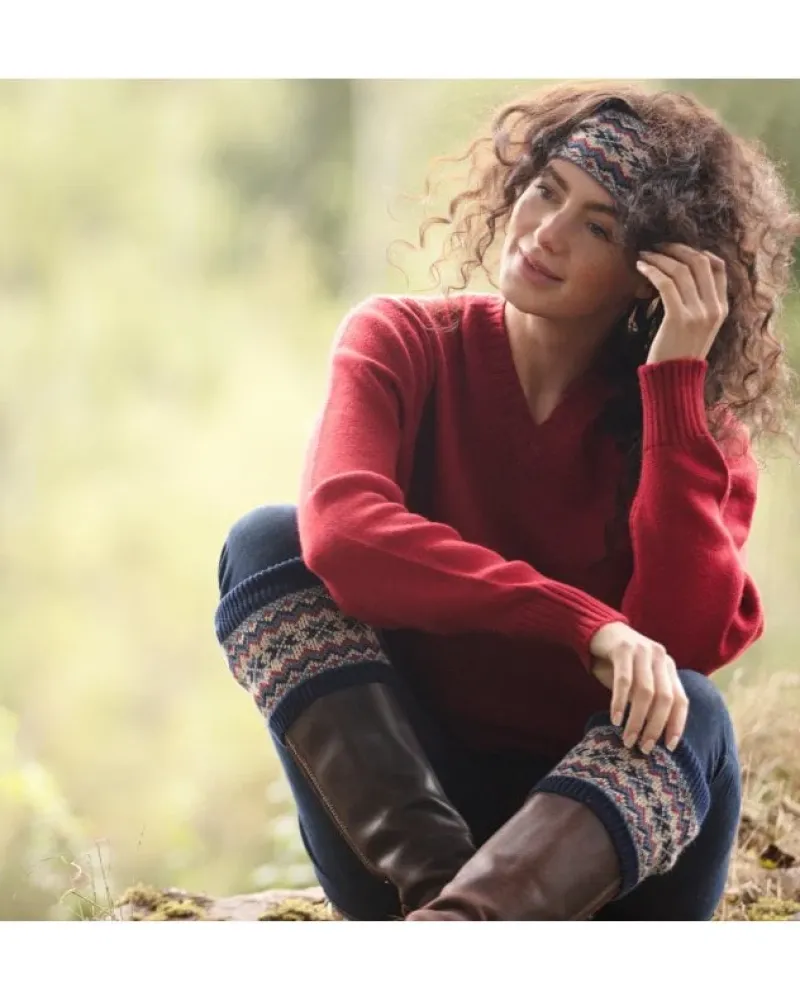 Ladies merino wool blend country socks. The intricate pattern and bright colours make this eye catching design one of our best selling styles. Great for wearing with country attire or jeans and boots for a more casual look. Designed, knitted and hand finished in Scotland.