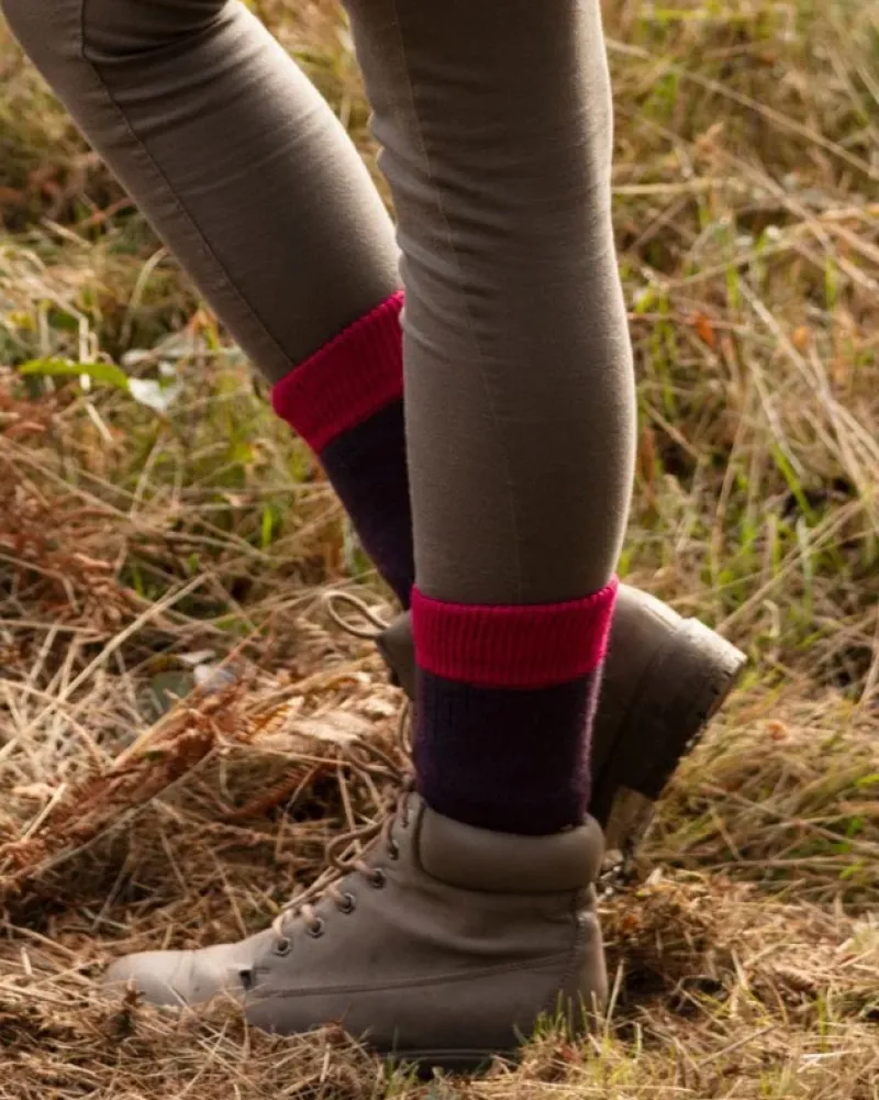 Ladies’ merino wool blend walking socks. Cushioned foot socks featuring a soft fit cuff, ribs for ventilation and lycra support at the ankle and instep. Knitted and hand finished in Scotland.