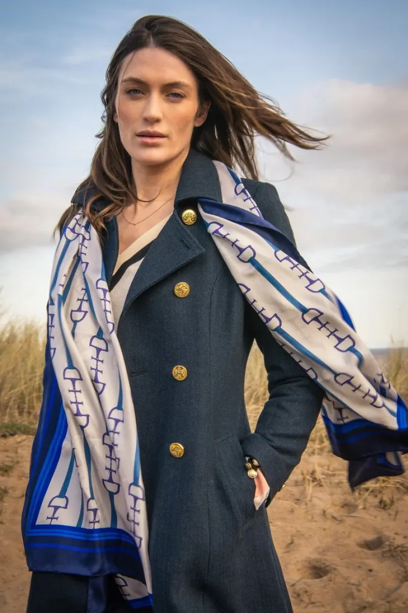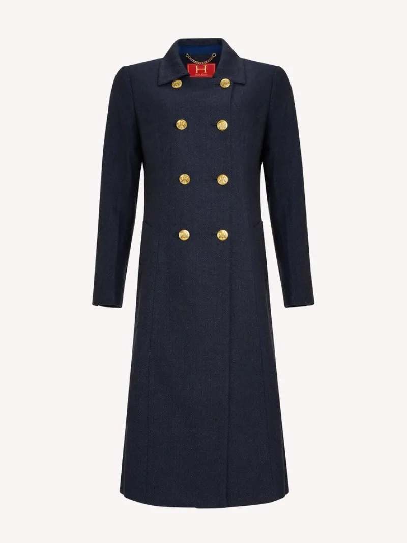 The rich navy colour and soft velvet trims provide a touch of luxury, while the attention to detail and impeccable craftsmanship ensure that this coat will last you for years to come. The classic and timeless design, combined with the practicality of the sturdy buttons and hip pockets, make this coat the perfect choice for any occasion.