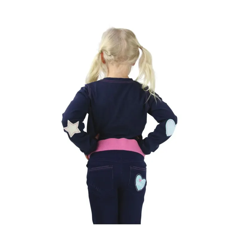 This long sleeve t-shirt is made from 100% cotton, making it both breathable and comfortable. The ‘I Love My Pony’ emblem adorns the front and star and heart elbow patches make this perfect to match to the rest of the collection! This stylish navy top is finished with pink stitching and Little Rider logo to the sleeve.