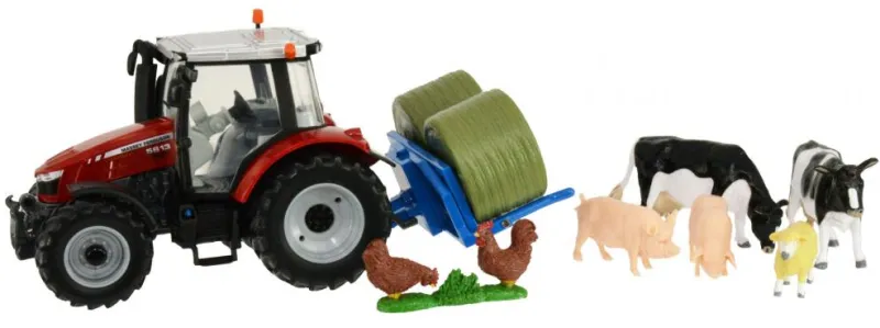 Massey Ferguson 5612 tractor and accessories set, tractor with original decal detail, enclosed cab, front wheel steering, front hitch, rear 3-point hitch and rolling wheels with tyre tread detail. Bale lifter with two round bales with hitch to attach to the rear hitch. 2 black and white cows, 2 pigs, sheep and 2 chickens also included.