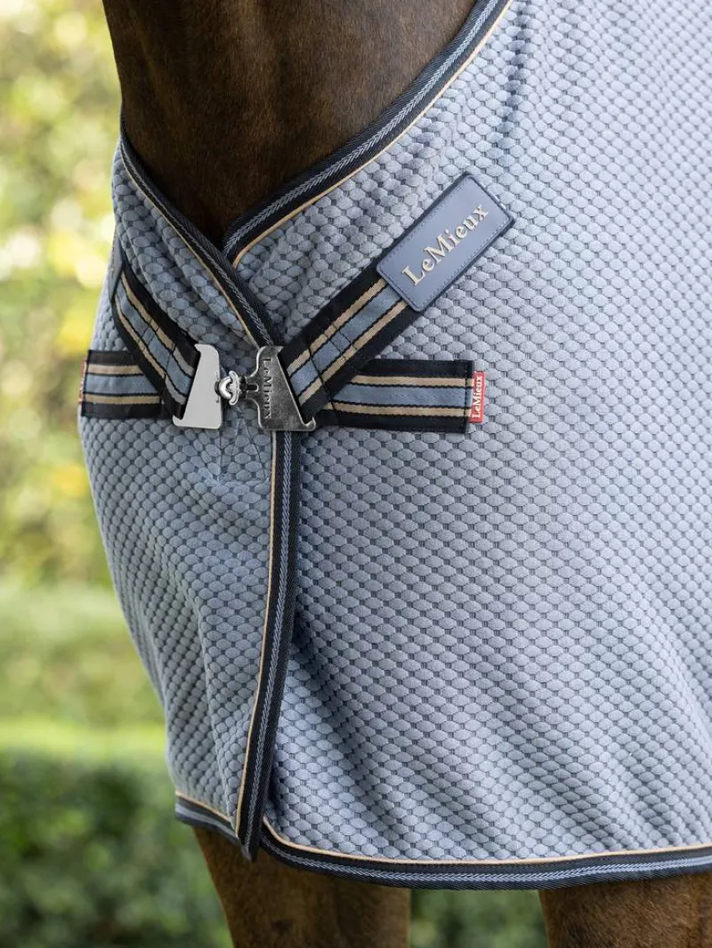 The Kudos Bamboo Cooler is known for its hexagonal pattern and distinctive suede effect trim that adds a touch of luxury. Whether used during travel, while in the box, or for post-workout recovery, this rug showcases LeMieux’s expertise in technical design. Featuring a soft bamboo blend outer fabric, Simuwool wither protection, and an anti-static and anti-bacterial shoulder lining, this rug effectively cools the key muscle groups after exercise. The angled T-bar front closure, hook and loop fastener, and cross surcingles provide additional security while the silicone dipped tail fillet cord adds a practical finishing touch.