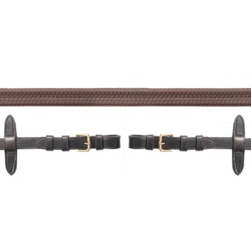 Simple Rubber Reins with buckles and medium width of 17 mm. The reins lay well in your hands and are fitted with martingale stops.