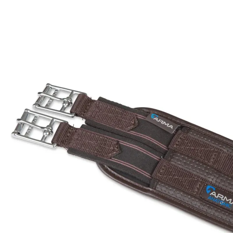 The ARMA anti-chafe contour girth is made from durable waffle material that resists moisture build up to protect against chafing. The textured surface reduces friction allowing the girth to glide smoothly and allows airflow to help control excessive sweat build up. Moisture resistant fabric stays soft and flexible. Anatomic contour shaping allows greater freedom of movement behind the elbows and helps distribute pressure. Flexible, stretch resistant and wipe clean, reinforced with non-stretch nylon webbing. Pressure alleviating elastic inserts at both ends. Stainless steel roller buckles and fittings for long lasting performance.
