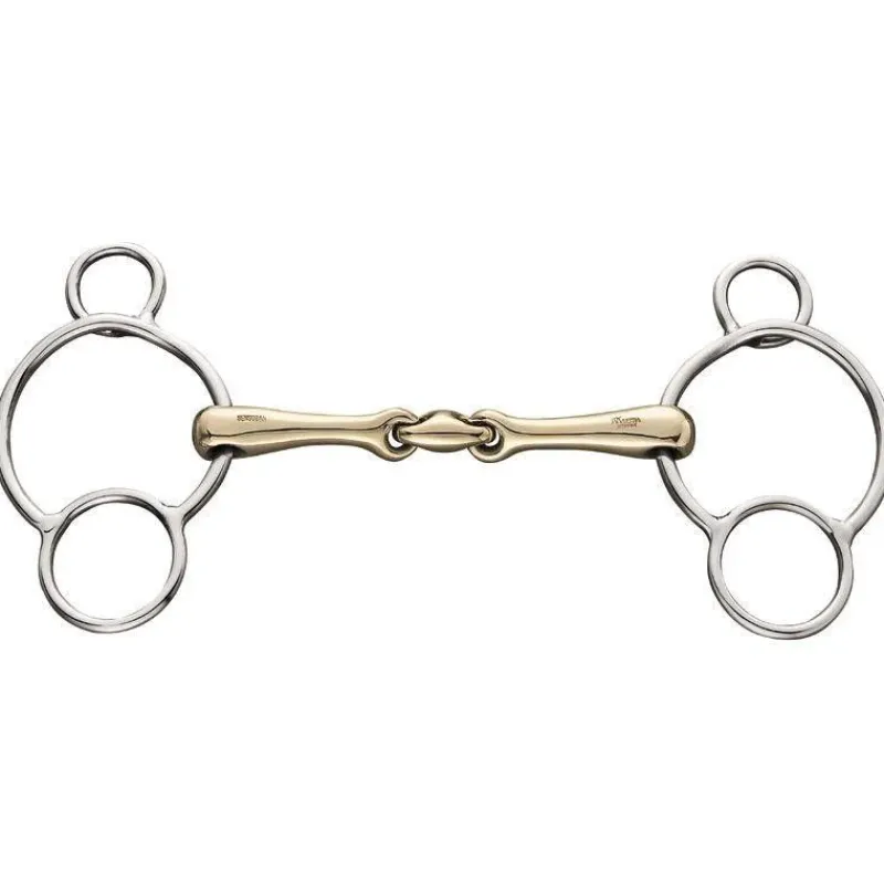 This bit is extremely versatile due to the different rein options. It is a good choice for sensitive horses as it is a little bit softer than model 40607, leading to a higher level of acceptance. The lever action has a slight delay due to the lateral offset position of the upper ring. Riders can additionally add a curb strap to get more direct action. The pressure on the poll is limited that way.